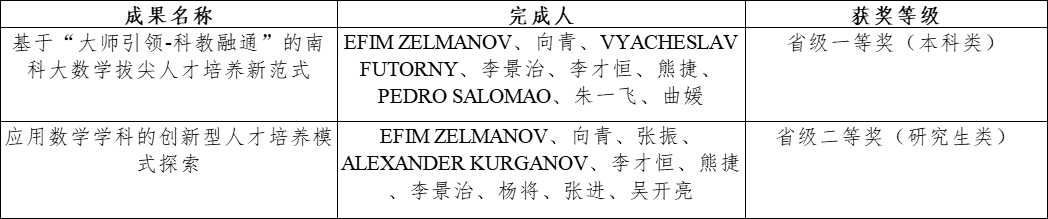 以上获奖成果由中国科学院外籍院士、菲尔兹奖得主Efim Zelmanov教授牵头,致力于探索具有“南科特色”的高层次复合型拔尖创新人才培养之路,以创新教学内容与方法、课程体系与育人模式为数学一流学科建设和教育强国建设添砖加瓦。