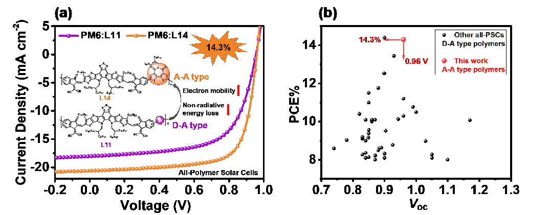 Figure 1. (a) The J–V characteristics of the all-PSCs based on L14 with an acceptor-acceptor (A-A) backbone and its donor-acceptor (D-A) analogous polymer L11. (b) Plots of PCE against Voc for all-PSCs reported previously with PCEs over 8% and this work. (Adv. Mater. 2020, 32, 2004183)