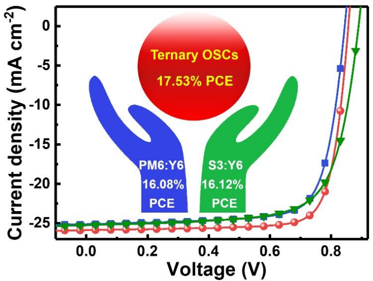 Figure 4. The J–V characteristics of organic solar cells based on PM6: Y6, S3: Y6, PM6:S3: Y6 blend film. (Energy Environ. Sci.2020, DOI:10.1039/D0EE02516J)