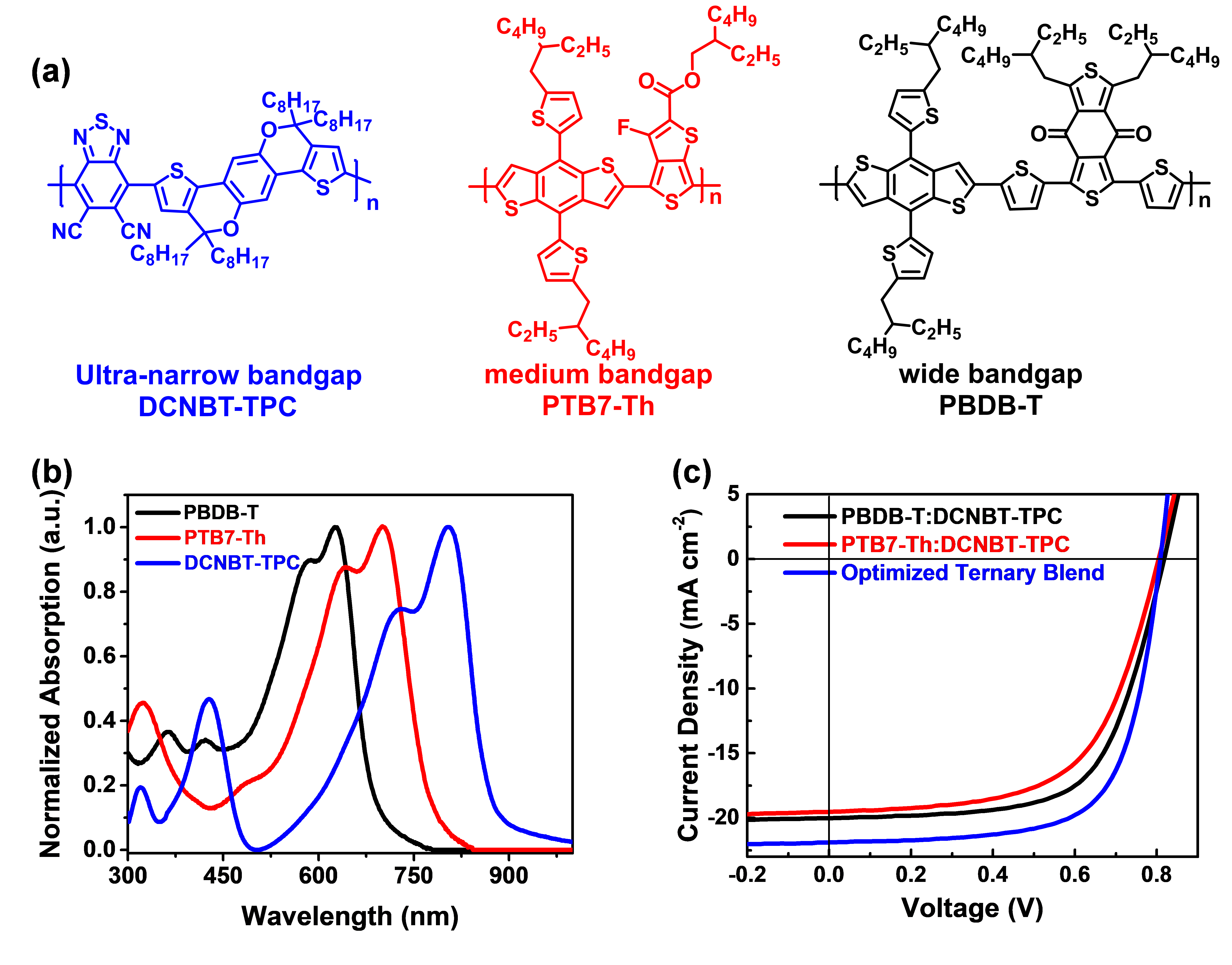 Developing organic solar cells based on ternary active layer is one of effective strategies to improve their photovoltaic performance. However, this strategy is very limited success in all-polymer solar cells due to the scarcity of high-performance narrow bandgap polymer acceptor and the challenge of morphology optimization in ternary bulk-heterojunction all-polymer blend films. In Advanced Materials, Professor Xugang Guo group has previously reported polymer acceptor DCNBT-TPC with the ultra-narrow bandgap (ultra-NBG) up to 1.38 eV. This polymer has strong absorption in long wavelength region, which breaks the absorption bottleneck limiting the performance of all-PSCs. In their fifth paper in Advanced Functional Materials and titled “Highly Efficient Ternary All-Polymer Solar Cells with Enhanced Stability.”, the team reported here a ternary system based on an ultra-NBG polymer acceptor DCNBT-TPC, a medium bandgap polymer donor PTB7-Th, and a wide bandgap polymer donor PBDB-T. The optimized ternary all-PSCs yield an excellent PCE of 12.1% with a remarkable short-circuit current density of 21.9 mA cm−2, which is the champion efficiency in ternary all-polymer solar cells (Figure 5). This work demonstrates that the utilization of a ternary all-polymer system based on ultra-NBG polymer acceptor blended with compatible polymer donors is an effective strategy to advance the all-polymer solar cells.