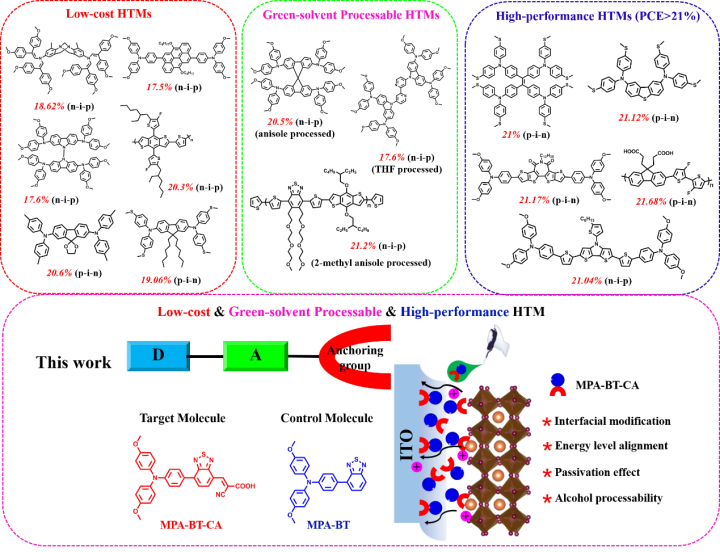 Figure 6. Chemical structures of the recently developed low-cost HTMs, green-solvent processable HTMs, and HTMs enabling state-of-the-art performance (first row) and chemical structures reported in this work along with a schematic diagram of the multifunctionality of MPA-BT-CA (second row). (J. Am. Chem. Soc. 2020, 142, 16632)