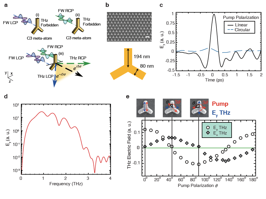Figure 1. Symmetry selection rules for THz wave generation using C3 meta-atoms. (A) Symmetry selection rules for generating THz pulses from a C3 meta-atom. (B) C3 Meta-atom dimensions, and sample orientation. Scale bar = 550 nm. (C) Generation of a single cycle THz pulse. (D) Corresponding frequency spectrum of the generated THz pulse. (E) The detected Ey and Ex components of the THz field.
