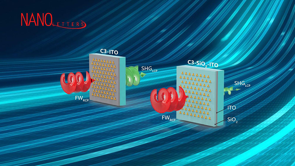 在该研究中,研究团队设计了工作在近红外波段的Au-ITO非线性光学复合超构表面。在泵浦光垂直入射的条件下,超构表面上产生的非线性二次谐波的强度相比于ITO薄膜本身有近10000倍的增强。其主要机理包括:(1)具有三重C3旋转对称性的金超构单元的表面等离激元共振在Au-ITO界面处可产生极强的局域电场,并且将泵浦光的平行于界面的电场分量高效地耦合至垂直界面的方向;(2) 根据电位移矢量的连续性边界条件,ITO薄膜中垂直界面的电场分量,将极大地获得增强,从而在ENZ波段附近提高ITO中二次谐波的转换效率;(3) 金超构单元的空间对称特性,可使得ITO薄膜中的泵浦光场分布具有中心反演对称破缺的性质。因此,这类复合超构表面中二次谐波辐射的增强效应与偏振选择定则在ENZ条件下依然适用。这为在亚波长尺度下实现对非线性微纳光学元件中的光场调控奠定了重要基础。