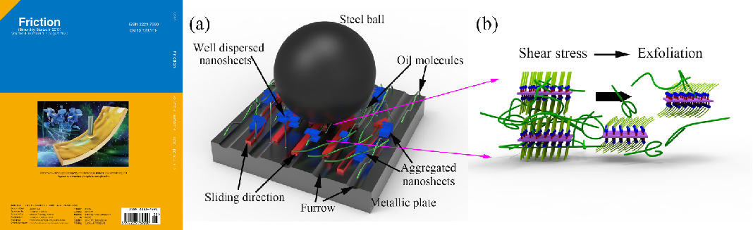 磷酸锆纳米片作为一种六边形二维纳米材料,在润滑抗磨方面有着广泛的应用前景;而在实际应用中,未改性的磷酸锆纳米片在润滑油中不能稳定分散,长时间后会形成沉淀,影响油的品质,从而降低油的润滑性。孙大陟教授团队从磷酸锆纳米片的结构出发,利用磷酸锆纳米片表面的磷酸羟基基团,结合润滑油主要由长链烃分子组成的特点,提出利用胺类来修饰磷酸锆纳米片的表面,进而提升磷酸锆纳米片在润滑油中的分散性。摩擦性能测试表明,润滑油摩擦系数和磨损体积都因磷酸锆纳米片分散性能的提升而大大降低。该研究成果提供了一种将二维纳米材料分散在润滑油中的方法,并将二维纳米材料分散性能和润滑油摩擦性能有机结合起来,为未来润滑添加剂的选择及改性提供了一个新的指导方向。成果研究论文“Dispersion-tribological property relationship in mineral oils containing 2D layered α-zirconium phosphate nanoplatelets”已发表在由清华大学主办的JCR摩擦学领域一区期刊Friction(2020, 8, 695–707,最新影响因子5.29)上,并被选为期刊封底论文,论文链接:https://doi.org/10.1007/s40544-019-0294-2