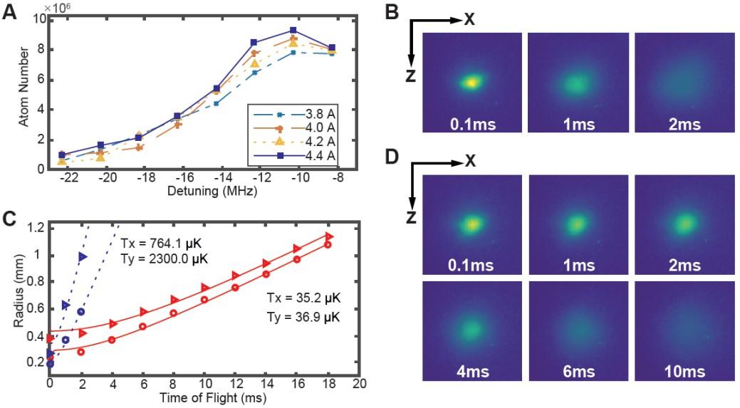 图3:基于介质超构表面光学芯片的磁光阱性能。(A) 捕获的原子数随激光失谐的变化关系,其中每条曲线对应固定的激光强度,每个数据点是五个实验结果的平均值,因此统计上的不确定性远小于绘图标记。在共振以下约10MHz的失谐处捕获的原子数达到峰值,距离87Rb跃迁相差约两个线宽。线圈电流为4.4A时,捕获的原子数约107。(B) 经过磁光阱后,87Rb原子云在不同膨胀时间下的吸收图像。(C) 拟合87Rb原子云半径在轴向(圆形)和径向(三角形)上与膨胀时间t的关系。蓝色虚线和红色实线分别拟合了经过磁光阱和光学粘团后的原子云膨胀。(D) 经过光学粘团后不同膨胀时间下87Rb原子云的吸收图像。