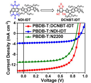 针对此问题,课题组开发了基于苯并噻二唑的新颖n-型高分子半导体,该半导体具有对太阳光更为有效的吸收,实现了超过8%的能量转化效率,是除了酰亚胺基n-型高分子半导体外的最高值。该工作为进一步开发新型窄带隙n-型高分子半导体材料奠定了基础。