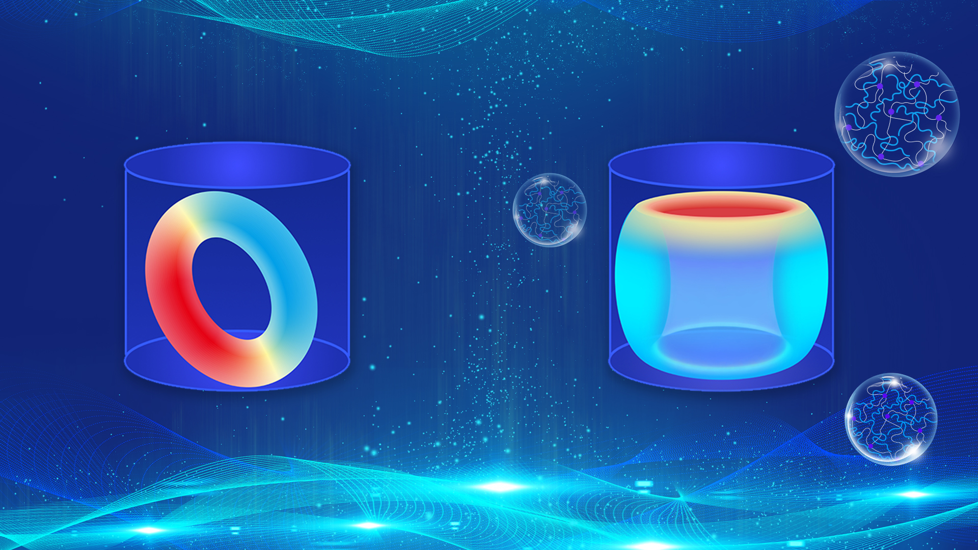Professor Xia’s group designed a novel experiment to measure the large-scale flow of a turbulent thermal convection system with polymer additives. The experiment was carried out in a cylindrical convection cell, and a small amount of long-chain polymers was added to the fluid. For the Newtonian fluid in Figure 1a, the dominant flow structure is the well-known single-roll LSC with a tilted elliptical primary vortex and two small diagonally opposite corner vortices. With a minute amount of long-chain polymers, the large-scale flow is dominated by intense upwelling along the symmetry axis and downwelling along the periphery (Figure 1b). The fountain-like flow pattern is consistent with the axisymmetry of the system and is what would be expected had it not been for the SSB that led to the LSC.