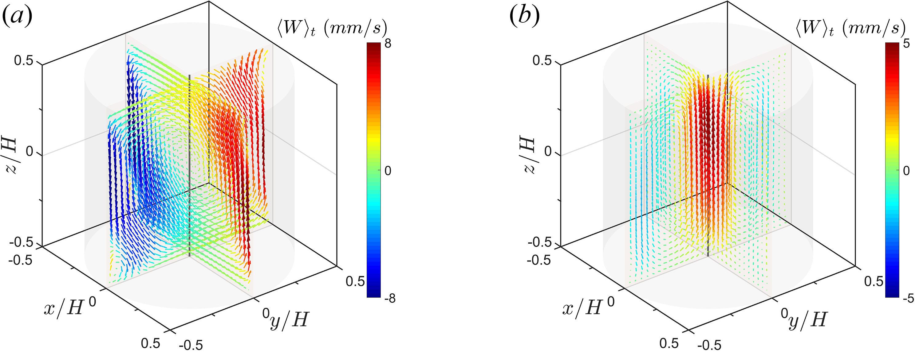 Figure 1. Time-averaged velocity field measured in two vertical orthogonal planes at polymer concentrations of (a) c = 0 showing a flow topology with spontaneous symmetry breaking, and (b) 20 ppm exhibiting an axisymmetric fountain-shaped flow topology