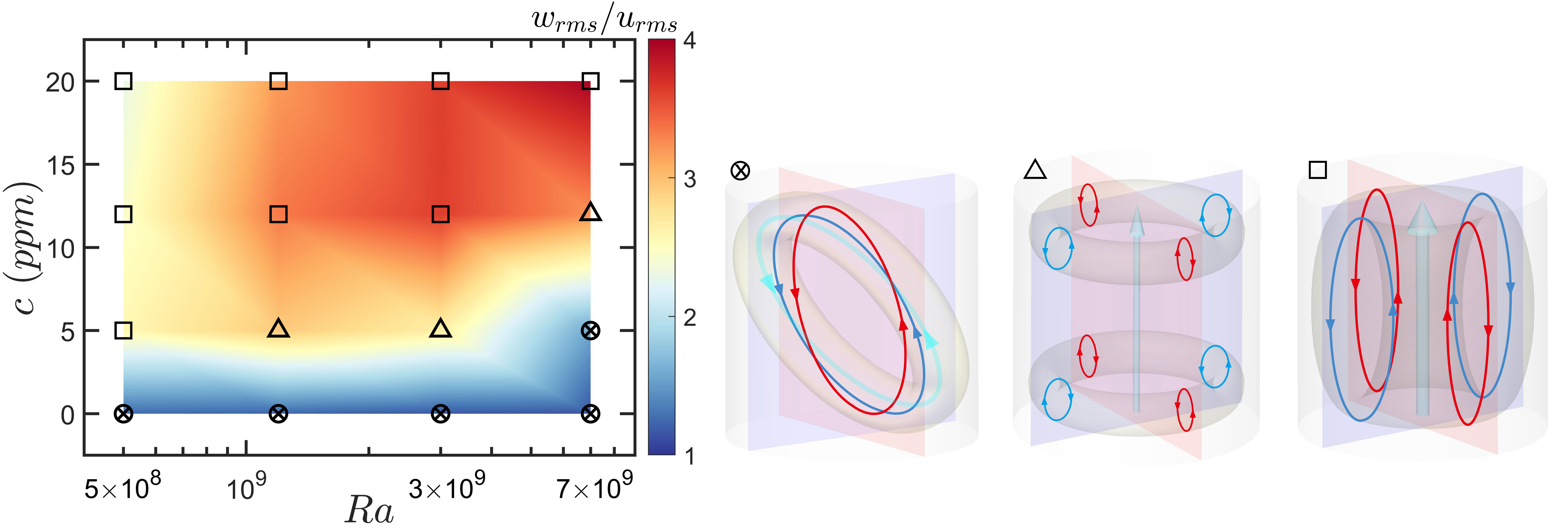 The researchers explored the parameter space for the observed large-scale flow topologies. Figure 2 shows a phase diagram based on measurements with various polymer concentrations and values of Ra. The anisotropy of velocity fluctuations is related to the topology of large-scale flow, i.e., the same flow topology has nearly the same value of Wrms/Urms, which is a measure of the anisotropy of fluctuations. This correspondence further suggests that axisymmetric structure results from anisotropic suppression of velocity fluctuations.