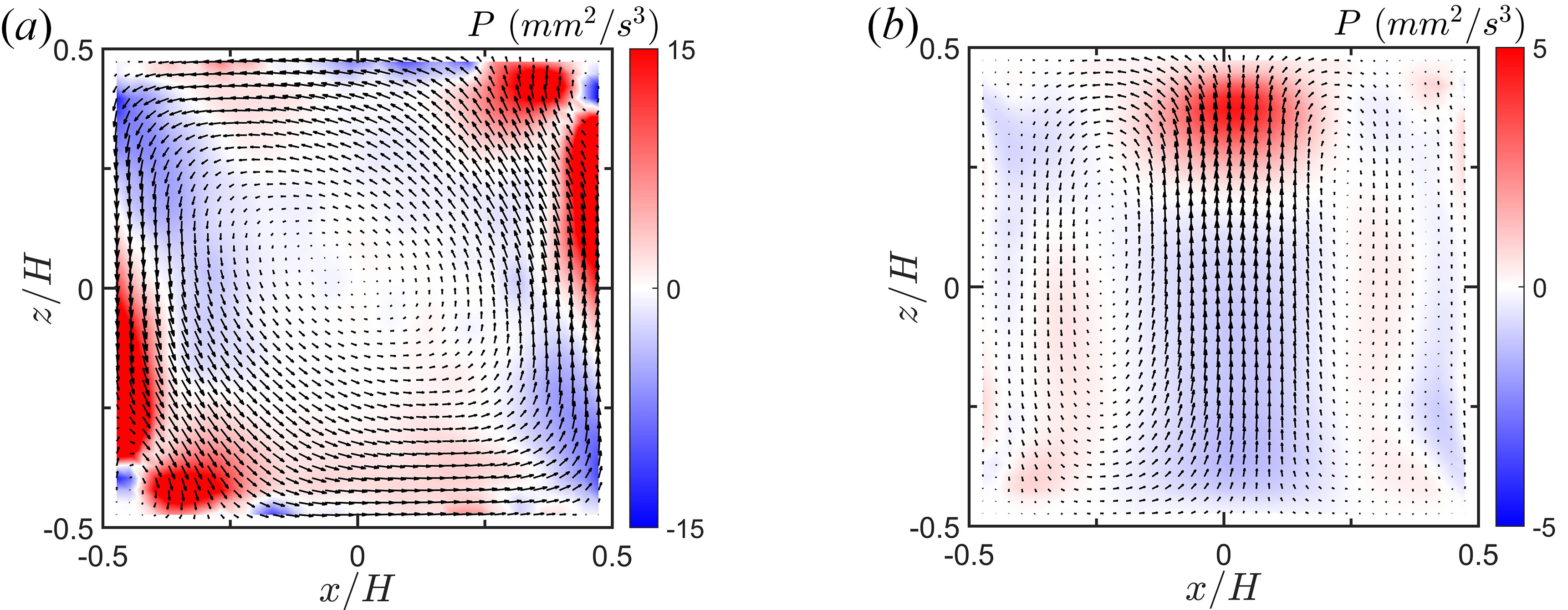 The group also examined how polymer additives change the energy transfer between mean flow and turbulence, quantified by the turbulent kinetic energy production. For the Newtonian fluid (Figure 3a), the energy transfer primarily occurs near the boundaries, where the viscous boundary layers develop. The net value is positive when integrated over the whole measurement plane, indicating that overall, the mean flow supplies energy to the turbulent fluctuations. With added polymers, the volume-integrated net turbulent kinetic energy production vanishes, and the turbulence production distribution significantly changes (Figure 3b). Therefore, adding polymers effectively changes the mechanism of energy transfer between the mean flow and turbulence.